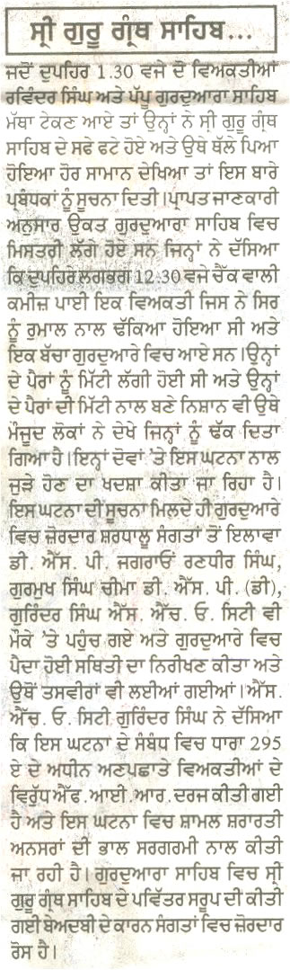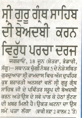 Headline: FIR lodged for disrespecting Shri Guru Granth Sahib.